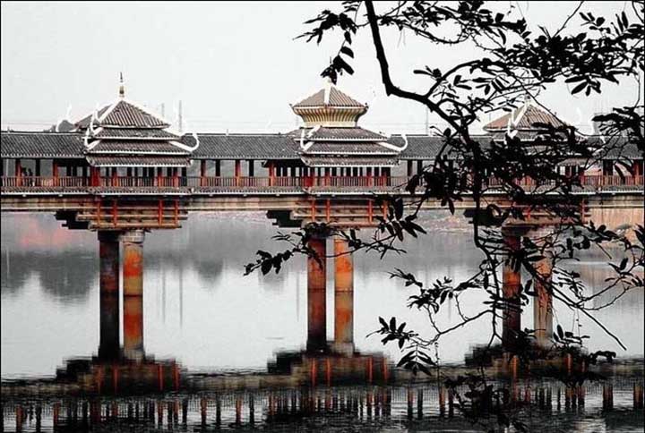 平坦地形的基地相對缺乏豐富景觀,其吸引力主要依靠人工建、構(gòu)筑物,建筑組群的剪影輪廓尤為重要。因此,要取得變化豐富的輪廓線,建筑之間恰當(dāng)?shù)慕M合、形體適當(dāng)對比和生動的屋面造型都需詳盡考慮。如:紅楓湖侗寨借鑒傳統(tǒng)侗族建筑風(fēng)雨橋的形式,回應(yīng)地方文脈,而變化豐富的天際輪廓線也為自然景色增添了人文內(nèi)涵。
