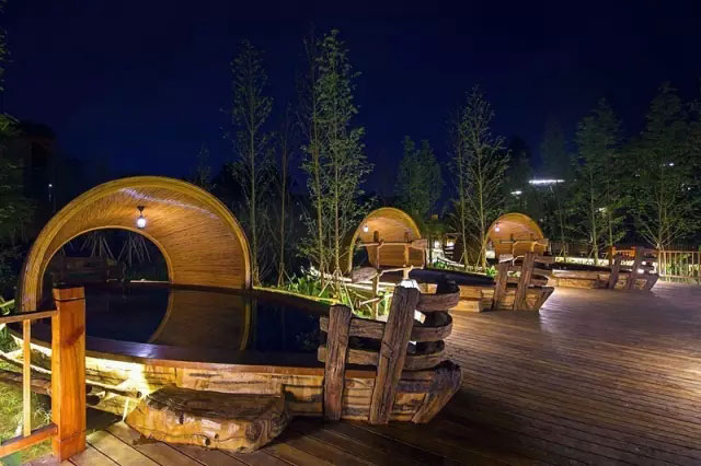 半山溫泉一共有46個(gè)泡池、3個(gè)干蒸房(男女賓各1個(gè)、藥浴養(yǎng)生區(qū)1個(gè))、1個(gè)濕蒸房、32張石板床和2間貴賓房。躺在最高的溫泉泡池里可以俯瞰鷺湖,聽(tīng)白鷺長(zhǎng)鳴,觀鷺島美景,十分愜意。