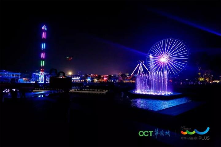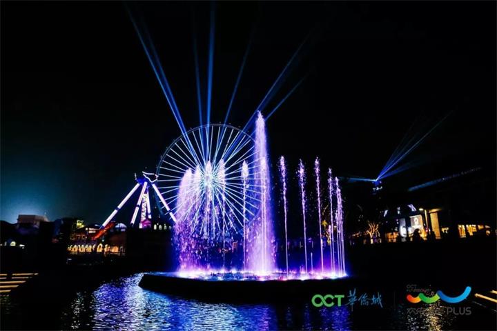 這場(chǎng)亞洲頂級(jí)的視聽盛宴將38米高的時(shí)光塔、99米高的摩天輪、湖面、牌坊廣場(chǎng)等地標(biāo)的全景燈光,與噴泉、音樂(lè)融合。